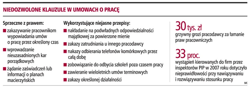 Podobny przykład to wprowadzenie do umów o pracę klauzul bezwzględnie zabraniających podejmowania jakiejkolwiek pracy u innego pracodawcy. Zdaniem prawników takie działanie pracodawcy będzie legalne tylko wtedy, gdy zakaz ten może być uzasadniony rodzajem wykonywanej już pracy. Jeśli jest ona np. czasochłonna, wymaga znacznych kompetencji i wiąże się z dużą odpowiedzialnością, to szef może uznać, że dodatkowa praca będzie negatywnie wpływać na wykonywanie obecnych obowiązków.