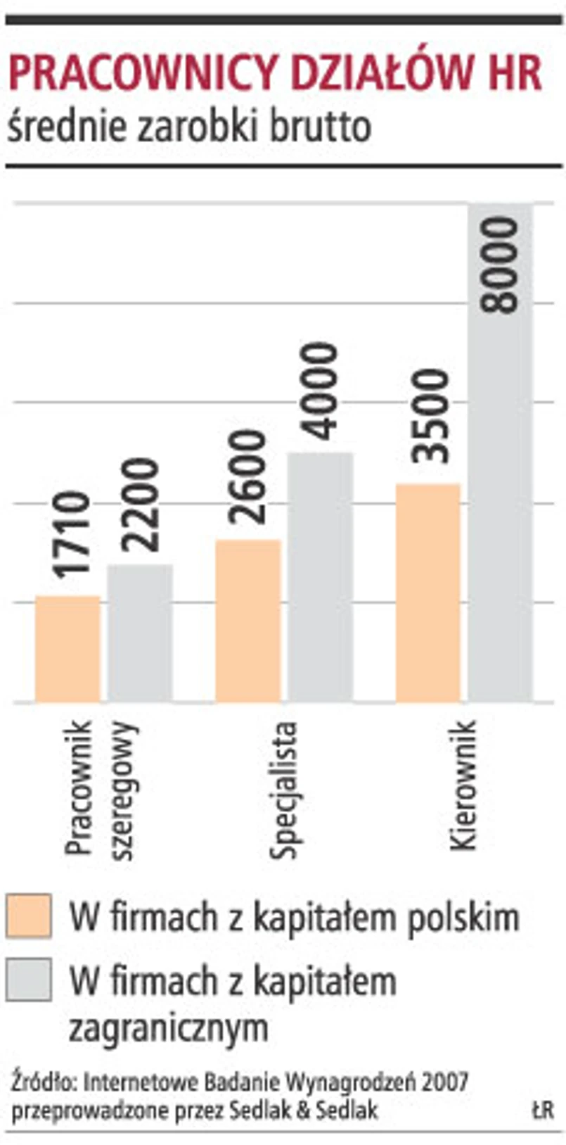 Wynagrodzenie pracowników poszczególnych szczebli w tych działach jest różne, w zależności od stanowiska, które zajmują. Jak wynika z raportu płacowego firmy Advisory Group TEST Human Resources, w ubiegłym roku pracownicy szeregowi zarabiali średnio na Mazowszu 2,7 tys. zł brutto, a w pozostałych regionach 2,5 tys. zł. Specjaliści otrzymywali na Mazowszu 4,4 tys. zł brutto, podczas gdy w innych regionach Polski około 200 zł mniej. Kierownicy w 2007 roku zarabiali w Polsce brutto średnio 6,9 tys. zł. Na Mazowszu oferowano im znacznie więcej, bo 8,6 tys. zł. Duża była także rozbieżność pensji wypłacanych dyrektorom działów personalnych. Na Mazowszu zarabiali oni średnio brutto 26 tys. zł., a w pozostałych regionach 16,7 tys. zł.