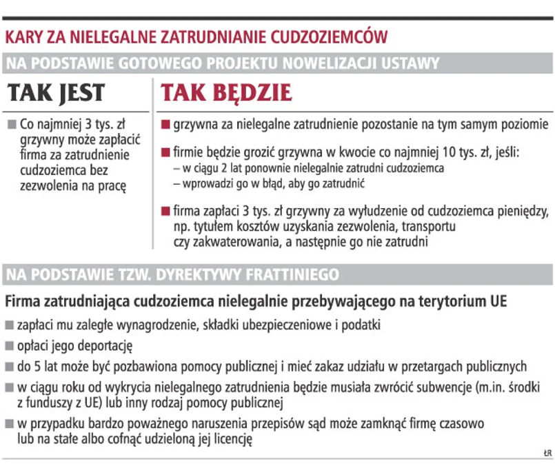 Rząd chce, aby kary za nielegalne zatrudnianie osób spoza Polski były wyższe. UE kończy prace nad dyrektywą zdecydowanie zaostrzającą kary nakładane na nieuczciwe firmy. Firmy zatrudniające nielegalnych emigrantów stracą na pięć lat prawo do korzystania ze środków unijnych.