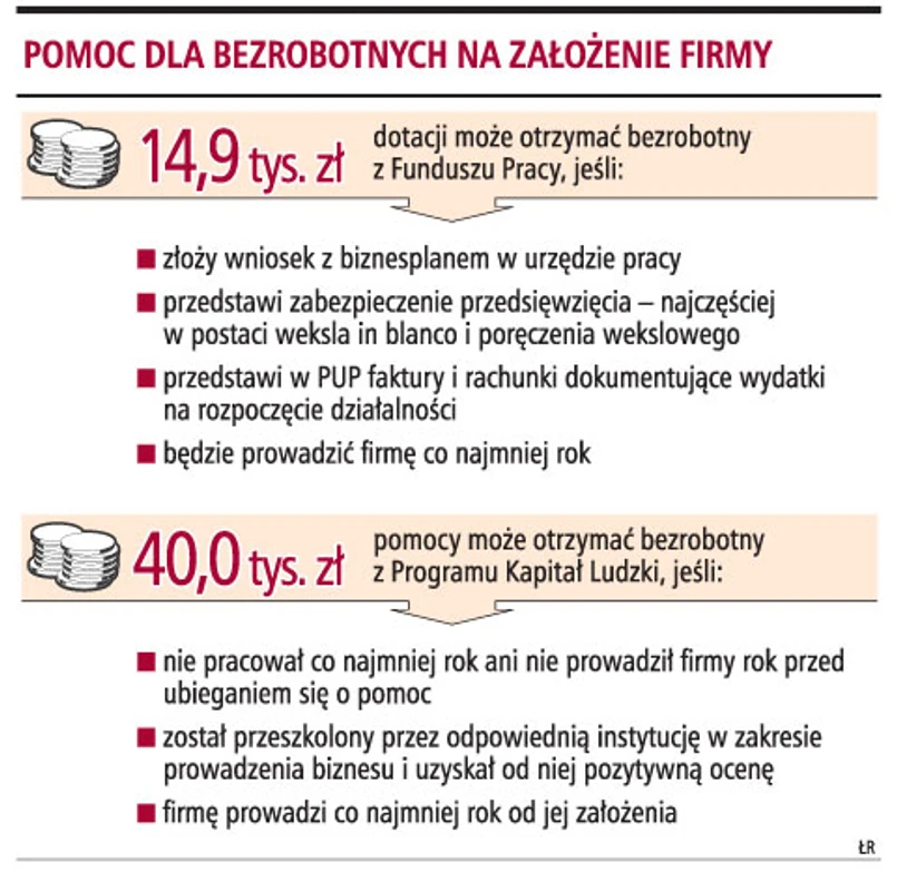 O pieniądze z UE może ubiegać się osoba, która nie była zatrudniona przez co najmniej 12 miesięcy w ciągu ostatnich dwóch lat. Jednak bezrobotny, który otrzyma wsparcie finansowe, nie może ubiegać się o dotację z Funduszu Pracy na rozpoczęcie działalności gospodarczej. Obecnie wsparcie takie wynosi równowartość pięciu średnich pensji.