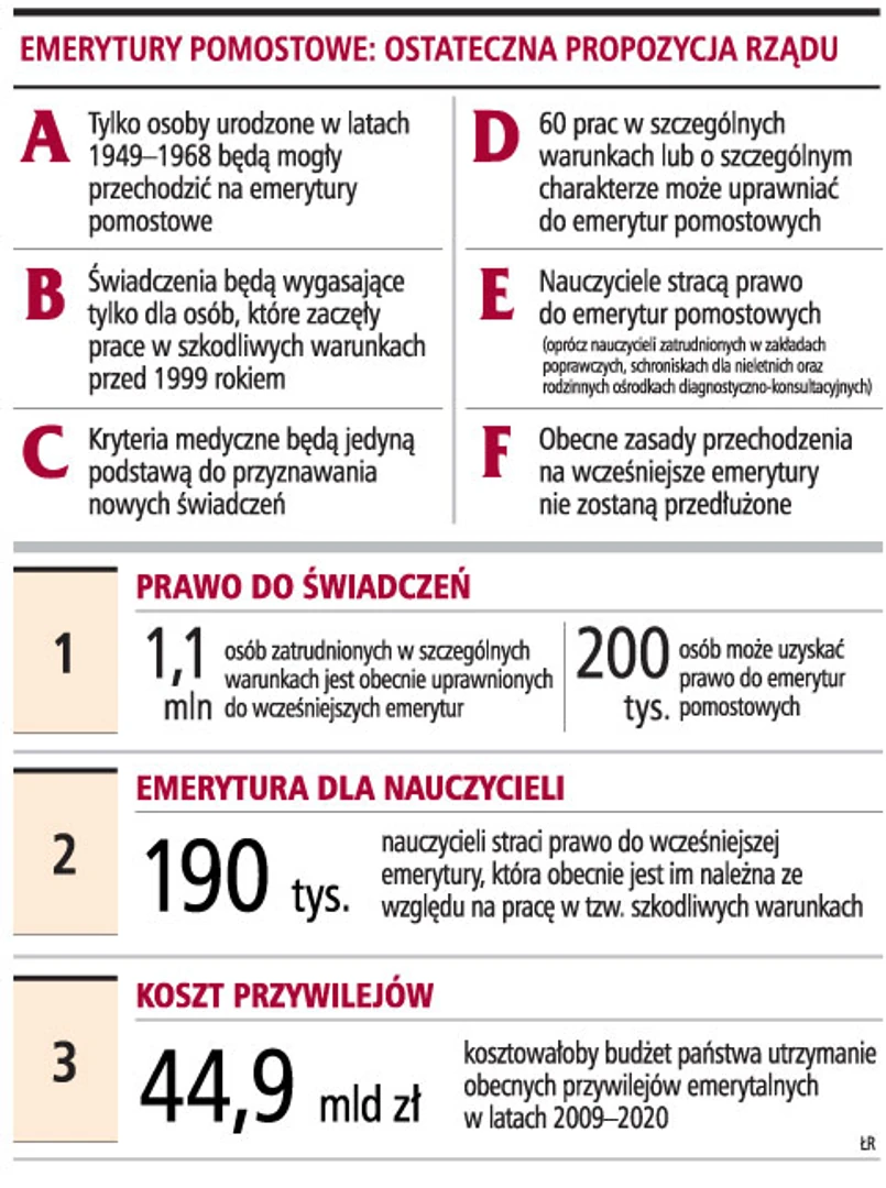 Rozmawiamy z AGNIESZKĄ CHŁOŃ-DOMIŃCZAK, wiceministrem pracy i polityki społecznej - W tym tygodniu kończą się konsultacje projektu ustawy o emeryturach pomostowych. Rząd zapowiada, że nie ulegnie presji związków i prawo do tych emerytur uzyska tylko 200 tys. osób wykonujących około 60 prac. Będą wypłacane wyłącznie osobom urodzonym w latach 1949-1968.