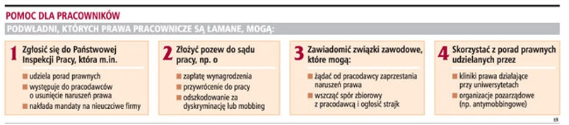 W dobie kryzysu gospodarczego pracodawcy mogą naruszać przepisy coraz częściej, m.in. z powodu gorszej kondycji finansowej. Pracownicy nie są jednak bezsilni. Jako słabsza strona stosunku pracy mogą liczyć na pomoc instytucji publicznych, społecznych i pozarządowych. Wystarczy zgłosić się do Państwowej Inspekcji Pracy, która może m.in. ukarać nieuczciwego pracodawcę mandatem lub skierować przeciwko niemu sprawę do sądu. Pomocy udzielają także związki zawodowe i stowarzyszenia (np. antymobbingowe). Pracownik może też sam dochodzić swoich praw przed sądem pracy.