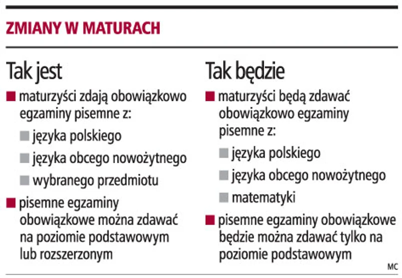Rezygnacja z jednego obowiązkowego egzaminu to nie jedyne zmiany, jakie rząd chce wprowadzić od 1 września 2009 r. Z projektu rozporządzenia wynika, że wszyscy uczniowie będą zdawać pisemnie obowiązkowe przedmioty wyłącznie na poziomie podstawowym, a wszystkie dodatkowe przedmioty - na poziomie rozszerzonym.