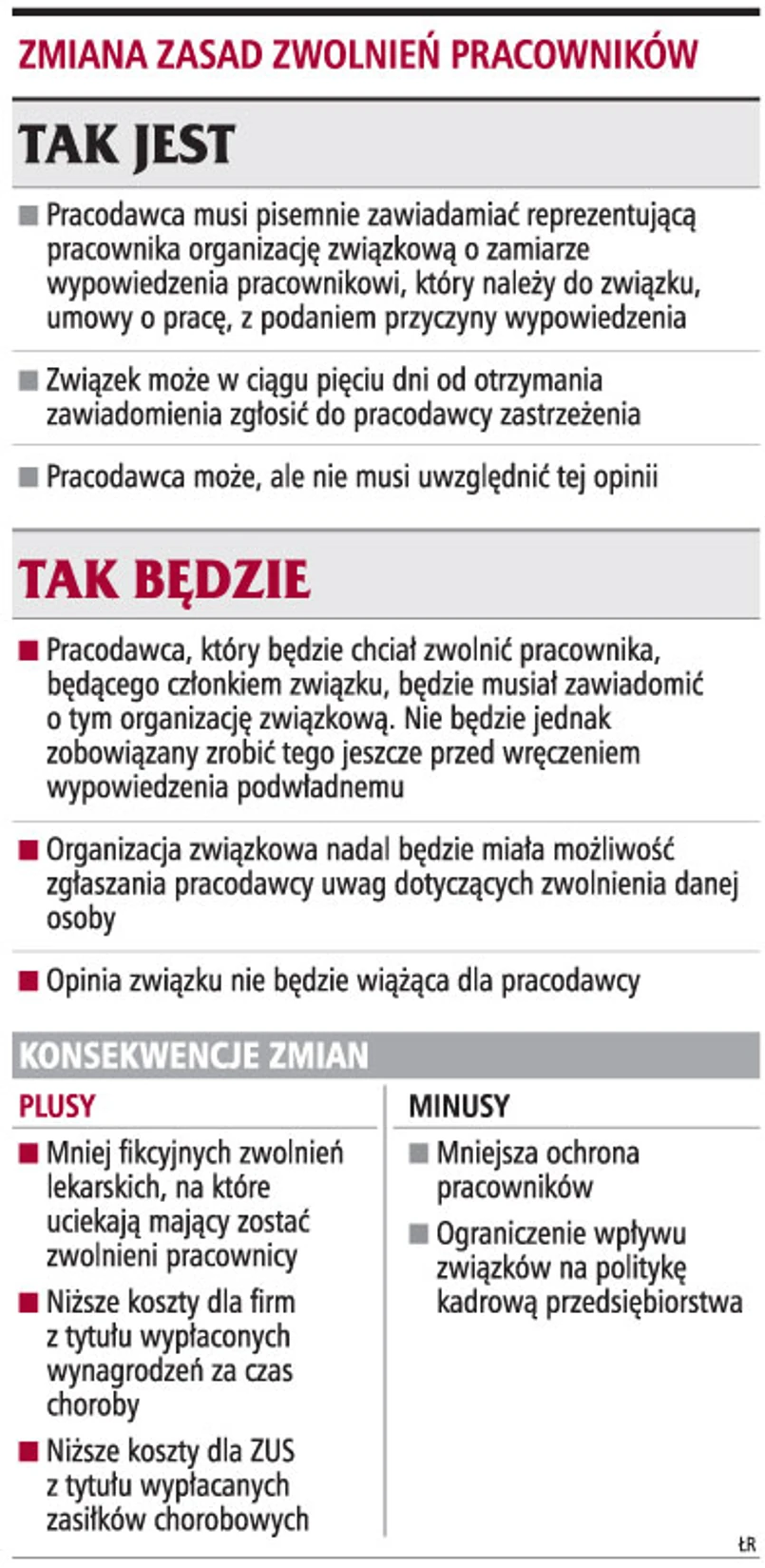 Ministerstwo Pracy i Polityki Społecznej zamierza do przygotowywanej nowelizacji kodeksu pracy wprowadzić przepis, zgodnie z którym pracodawca będzie musiał wprawdzie uzyskiwać opinię związku w sprawie zwalnianego pracownika, ale nie przed wręczeniem mu wypowiedzenia, a już po tym fakcie. Obecnie, zgodnie z art. 38 k.p. organizacja związkowa musi być poinformowania o zamiarze
