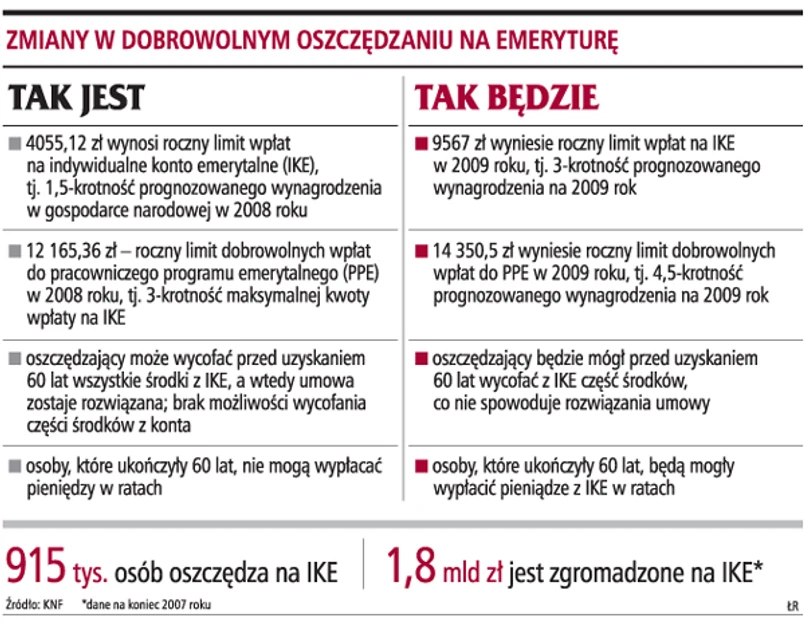 Przygotowana przez resort pracy nowelizacja ustawy z 20 kwietnia 2004 r. o indywidualnych kontach emerytalnych (Dz.U. nr 116, poz. 1205 z późn. zm.) przewiduje, że roczny limit wpłat na IKE wzrośnie z 1,5-krotności średniego miesięcznego wynagrodzenia w gospodarce narodowej do trzykrotności tej płacy. W założeniach do ustawy budżetowej na 2009 rok rząd przyjął, że wynagrodzenie to wyniesie 3189 zł. Oznacza to, że rocznie na IKE będzie można wpłacić 9,56 tys. zł (w tym roku 4055,12 zł).
