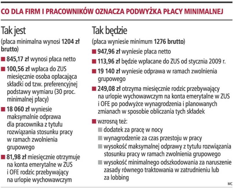 Od 1 stycznia 2009 r. więcej zarobią pracownicy opłacani według najniższych stawek, wykonujący pracę w porze nocnej oraz ci, którzy byli gotowi do jej wykonywania, ale z winy pracodawcy nie mogli jej świadczyć. Wzrosną też odszkodowania, m.in. za mobbing i odprawy z tytułu rozwiązania stosunku pracy w ramach zwolnienia grupowego. Więcej pieniędzy wpłynie też na konta emerytalne osób przebywających na urlopach wychowawczych. Z drugiej strony wyższe składki do ZUS zapłacą wybrane osoby prowadzące firmy. Między innymi takie skutki przyniesie podwyższenie od początku 2009 r. kwoty minimalnego wynagrodzenia za pracę z 1126 zł do 1276 zł. Komisja Trójstronna przyjęła już uchwałę w tej sprawie.