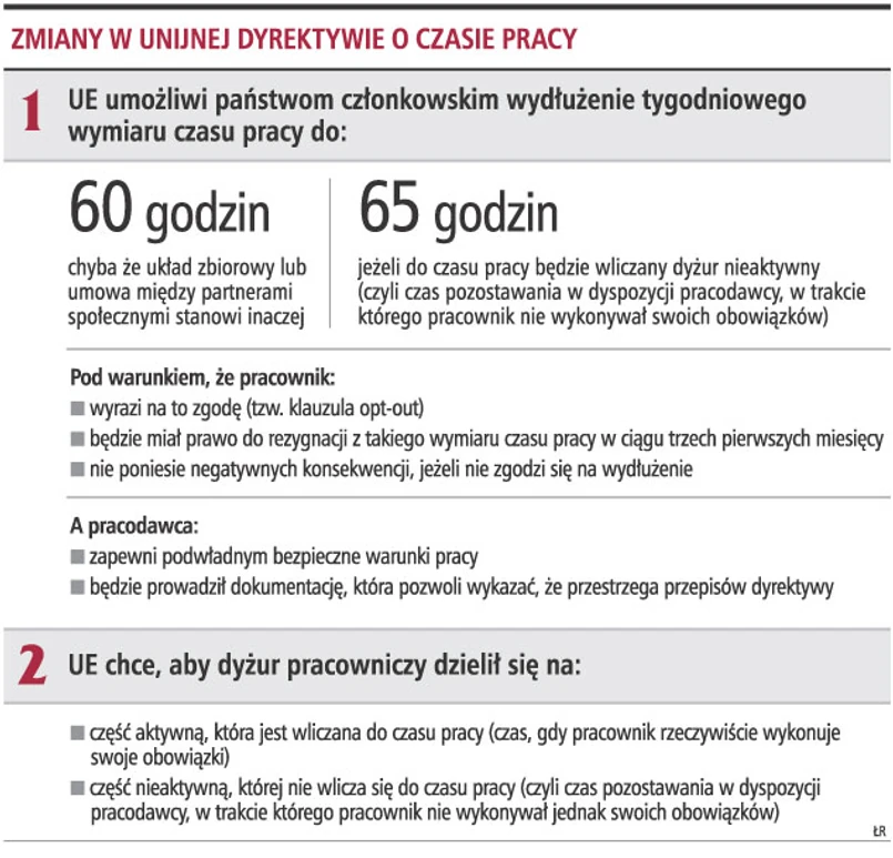 Z projektu unijnej dyrektywy wynika, że możliwość wydłużenia tygodniowego wymiaru czasu pracy z obecnych 48 godz. do 60 lub nawet 65 godzin (w maksymalnie sześciomiesięcznym okresie rozliczeniowym) będzie dotyczyć wszystkich pracowników. Państwa członkowskie będą mogły wprowadzić takie rozwiązania do prawa krajowego.