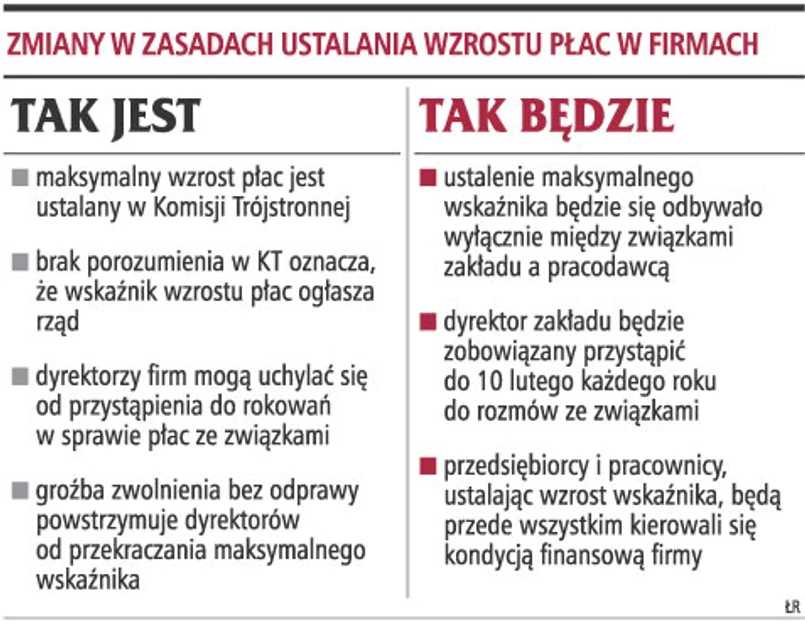Zmiana prawa - Związki chcą zniesienia limitu wzrostu płac w państwowych przedsiębiorstwach. Argumentują, że o podwyżkach powinna decydować sytuacja firmy, a nie Komisja Trójstronna czy rząd.
