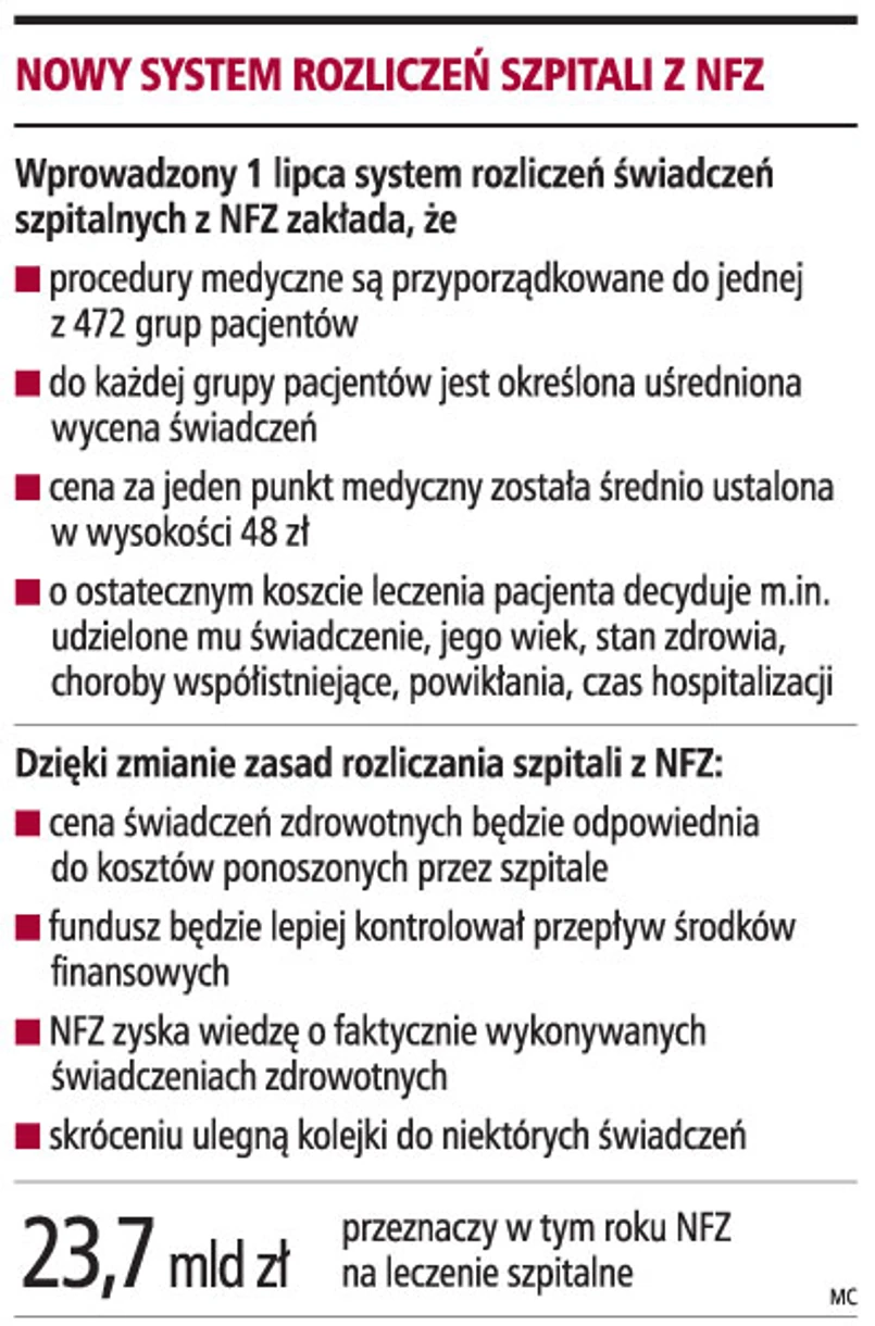 Od 1 lipca katalog świadczeń szpitalnych został zastąpiony przez system jednorodnych grup pacjentów. O tym, ile kosztuje leczenie konkretnego pacjenta, decyduje już nie tylko świadczenie, które zostało mu udzielone, ale również jego wiek, stan zdrowia, wykonane badania czy czas hospitalizacji. Za pomocą programu komputerowego tzw. grupera, pacjent jest kwalifikowany do poszczególnej grupy i dopiero na tej podstawie wycenia się koszt jego leczenia. Do każdej grupy pacjentów została przypisana uśredniona wartość świadczeń. Wzrosła bowiem średnia cena, jaką NFZ płaci za tzw. jeden punkt medyczny. Obecnie jest to 48 zł.