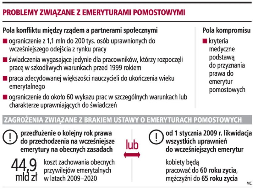 Resort pracy nie zakończył prac nad projektem ustawy o emeryturach pomostowych, tłumacząc to trwającymi konsultacjami. Wczoraj rząd ustąpił związkom i prawo do emerytur pomostowych mają zyskać osoby urodzone po 1968 roku. Eksperci ostrzegają, że Sejm będzie mieć za mało czasu na przyjęcie ustawy, która ma zacząć obowiązywać od 2009 roku.
