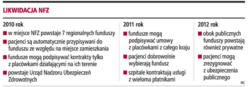 Rok później, czyli od 2011 roku, regionalne fundusze będą mieć możliwość podpisywania kontraktów z placówkami medycznymi z całego kraju. Świadczeniodawcy będą mogli zawierać umowy z kilkoma płatnikami. Natomiast pacjenci uzyskają pełną dowolność w wyborze ubezpieczyciela. Oznacza to, że osoba mieszkająca na Mazowszu będzie mogła się ubezpieczyć w funduszu działającym na Śląsku.