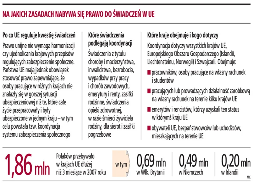 Na podstawie danych GUS można szacować, że w państwach UE, Europejskiego Obszaru Gospodarczego (Islandii, Liechtensteinie, Norwegii) i Szwajcarii pracę, od czasu naszego przystąpienia do UE, podejmowało około 2 mln Polaków. Jeśli byli legalnie zatrudnieni, ZUS, wyliczając im emeryturę, a wojewódzki urząd pracy zasiłek dla bezrobotnych, uwzględnią okres pracy i ubezpieczenia za granicą.