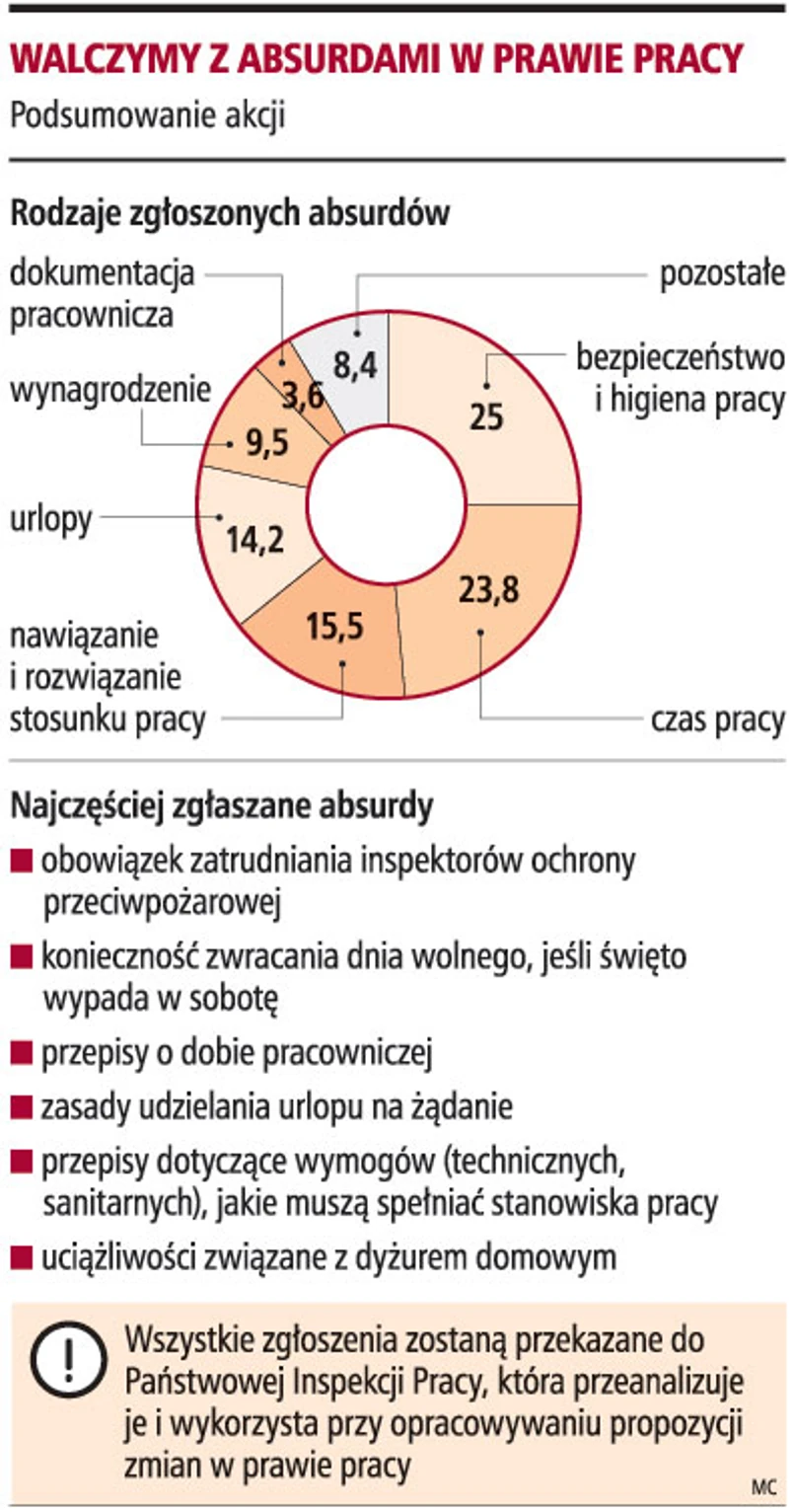Dla firm uciążliwe są przepisy bhp, a dla pracowników - regulacje dotyczące urlopów i wynagrodzeń. Czytelnicy i internauci najczęściej skarżyli się na konieczność zatrudniania inspektorów ochrony przeciwpożarowej. Przykłady absurdów zostaną przekazane Państwowej Inspekcji Pracy, która przygotuje propozycje zmian w przepisach.