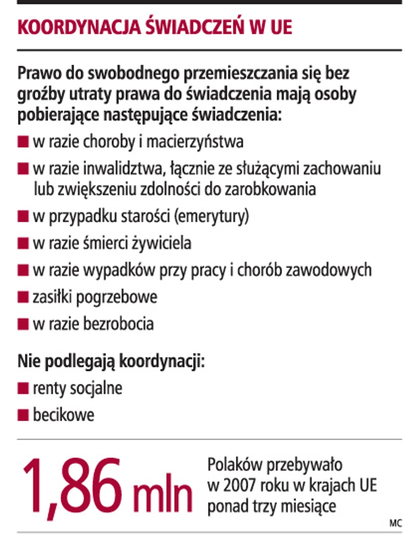 - Koordynacja nie dotyczy świadczeń niezwiązanych z opłacaniem składki, o specjalnym charakterze, które znajdują się na granicy pomocy społecznej i zabezpieczenia społecznego. Świadczenia te wypłacane są tylko na terytorium państwa, w którym dana osoba mieszka, na podstawie przepisów obowiązujących w tym kraju. W Polsce jest to tzw. becikowe i renta socjalna - wyjaśnia Agnieszka Chłoń-Domińczak.