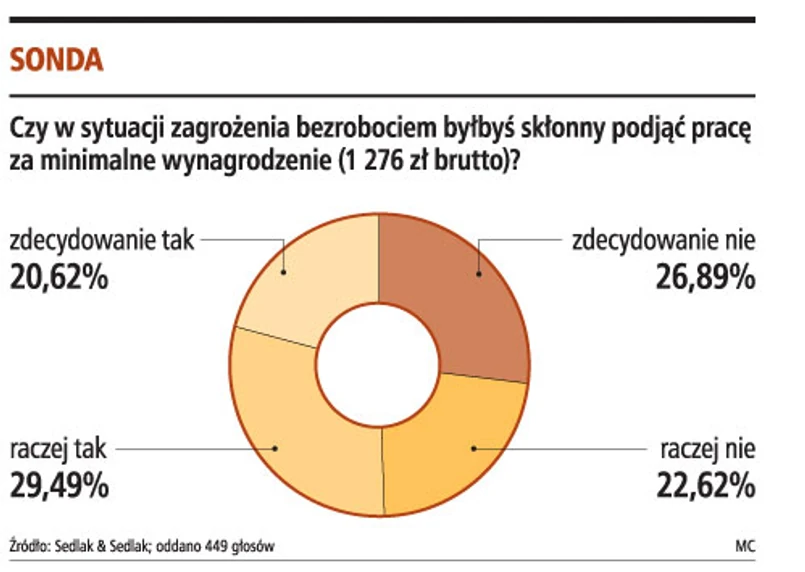 Minimalne wynagrodzenie, czyli najniższa kwota brutto, jaką pracodawca musi zapłacić pracownikowi zatrudnionemu na podstawie stosunku pracy w pełnym wymiarze czasu pracy, wynosi od 1 stycznia 2009 r. 1276 zł (netto to 955,96 zł) w sytuacji zagrożenia bezrobociem zgodziłoby się otrzymywać 50,1 proc. ankietowanych. Co piąty przyjąłby taką pracę, a co trzeci zadeklarował gotowość do przyjęcia takiej oferty. 49,9 proc. nie zaakceptowałoby stawki minimalnej nawet pod groźbą utraty pracy.
