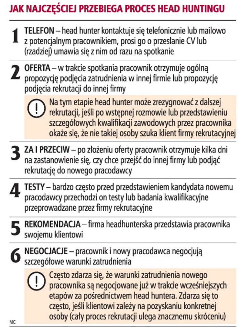 Rekrutacja pracownika, prowadzona przez head hunterów rozpoczyna się zazwyczaj od rozmowy telefonicznej lub korespondencji mailowej. W ten sposób tzw. łowca głów proponuje spotkanie, w trakcie którego przedstawia ofertę zatrudnienia u innego pracodawcy.