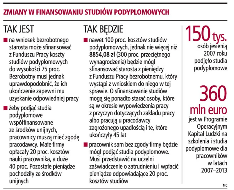 Rząd chce zmienić zasady finansowania studiów podyplomowych dla bezrobotnych i niektórych pracowników. Przewiduje to rządowy projekt nowelizacji ustawy o promocji zatrudnienia i instytucjach rynku pracy. Zgodnie z nim będą oni mogli otrzymać prawie 9 tys. zł na sfinansowanie swojej nauki. Wszyscy pracownicy będą natomiast mogli skorzystać z dopłat do studiów podyplomowych ze środków unijnych. Zdaniem ekspertów, choć nowe zasady finansowania studiów podyplomowych spowodują, że więcej pracowników niż dotychczas podejmie naukę, to nie będzie to miało wpływu na sytuację na rynku pracy.