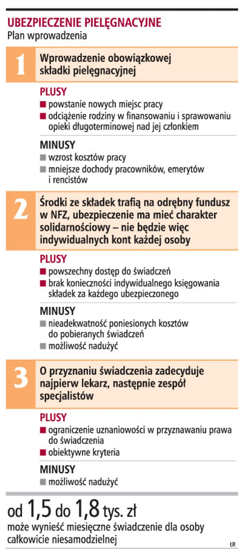 Dodaje, że świadczenie dla osoby całkowicie niesamodzielnej wynosiłoby od 1,5 do 1,8 tys. zł. Ważnym skutkiem wprowadzenia nowej składki byłoby stworzenie nowych miejsc pracy dla opiekunek czy rehabilitantów.