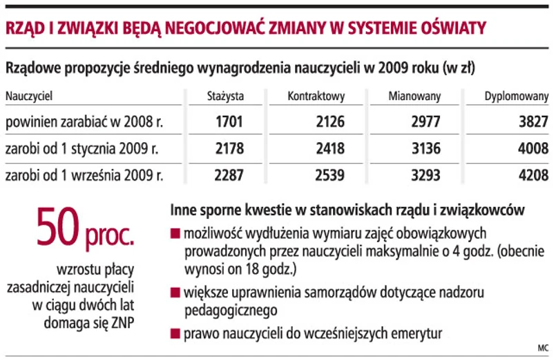 Rząd podtrzymuje propozycje podwyższenia pensji nauczycieli w 2009 dwukrotnie po 5 proc. Związek Nauczycielstwa Polskiego domaga się 50-proc. wzrostu wynagrodzeń w ciągu dwóch lat. Realne podwyżki pensji mogą być niższe, bo rząd chce umożliwić samorządom wydłużenie pensum nauczycieli.