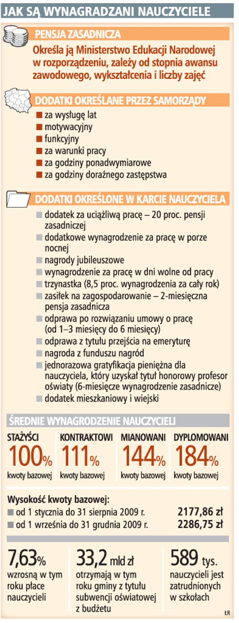 Samorządy, które nie zapewniają średnich płac nauczycielom, i te, które wydały nowe regulaminy, ale nie gwarantują średnich pensji, muszą do końca roku wypłacić im tzw. dodatek uzupełniający. Do jego wypłacenia zobowiązała je ostatnia nowelizacja Karty Nauczyciela. Od tego roku, co też jest nowością, to RIO mają dopilnować, czy gminy wypłacają nauczycielom średnie pensje. Jednak samorządy, z obawy przed kontrolą i z uwagi na niezmiernie skomplikowany system ich ustalania, domagają się uproszczenia procedur wyliczania płac.