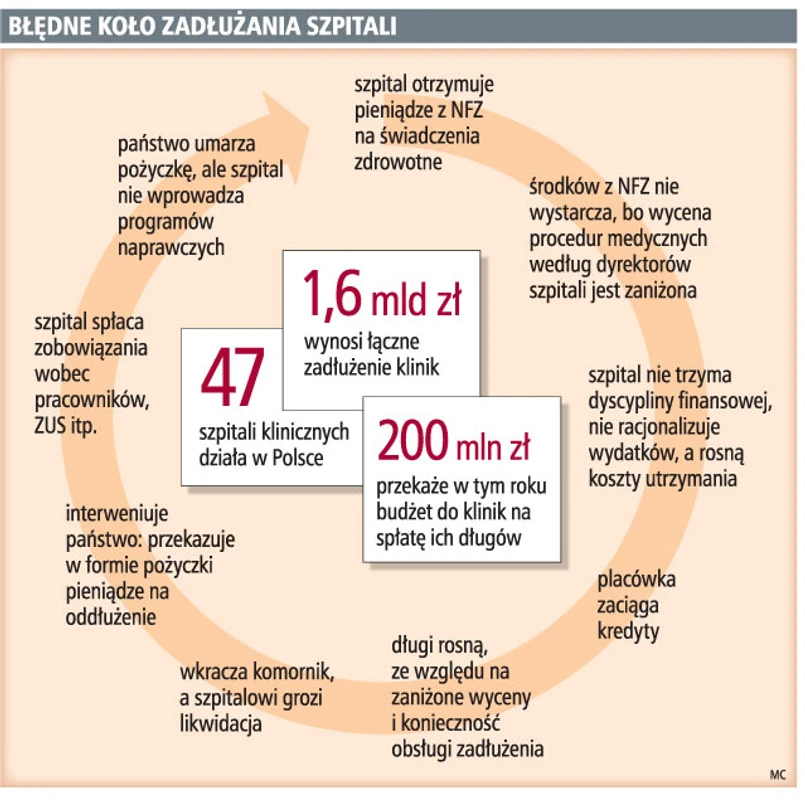 W 2001 roku, gdy organami założycielskimi klinik stały się akademie medyczne, szpitale te były zadłużone na 667 mln zł. Obecnie ich dług wynosi ponad 1,59 mld zł. W spłacie ich długów niewiele pomogły dodatkowe środki, jakie od trzech lat otrzymują z budżetu w ramach specjalnego rządowego programu. Dzięki niemu od 2007 roku do szpitali trafiło dodatkowo 650 mln zł. Pozwoliło im to na spłatę części zobowiązań wobec kontrahentów czy banków, ale nie spowodowało realizacji programów naprawczych. Większość klinik w ogóle nie wprowadziła zmian w sposobie organizacji swojej pracy.