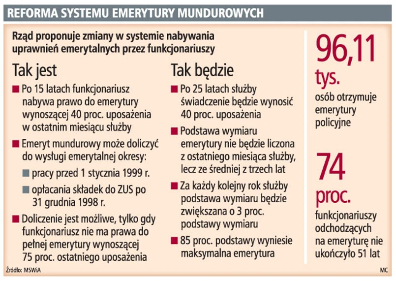 Policjanci wstępujący do służby w 2011 roku lub później będą przechodzić na emerytury według nowych zasad. Prawo do częściowej emerytury funkcjonariusze mają nabywać nie po 15, ale po 25 latach służby. Związki zawodowe zapowiadają protesty, jeśli rząd w projekcie ustawy nie uwzględni ich postulatów.