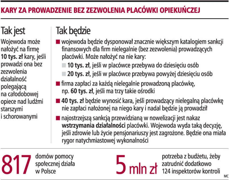 Od stycznia 2009 r. wszystkie firmy chcące prowadzić placówki opiekuńcze będą musiały mieć zezwolenie od wojewody. Wynika to z projektu nowelizacji ustawy o pomocy społecznej przygotowanego przez resort pracy. Za działanie bez zezwolenia grozić będą kary finansowe od 10 do 40 tys. zł. Wojewoda, który zyska nowe uprawnienia kontrolne, będzie mógł także zamknąć placówkę, jeśli uzna, że życie i zdrowie pensjonariuszy jest zagrożone.