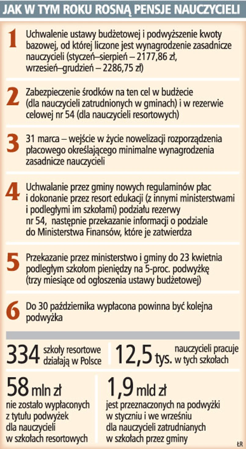 Dla zdecydowanej większości nauczycieli organem odpowiedzialnym za wypłacenie podwyżek są samorządy. Te wywiązały się z tego obowiązku. Jak ustaliliśmy, nie zrobiła tego jednak dotychczas większość ministerstw prowadzących tzw. szkoły resortowe, w których pracuje kilkanaście tysięcy nauczycieli. Dyrektorzy, m.in. szkół leśnych, rolniczych, muzycznych, baletowych są zdezorientowani, bo nie mają żadnych informacji, kiedy otrzymają pieniądze. Coraz bardziej obawiają się też pozwów nauczycieli.