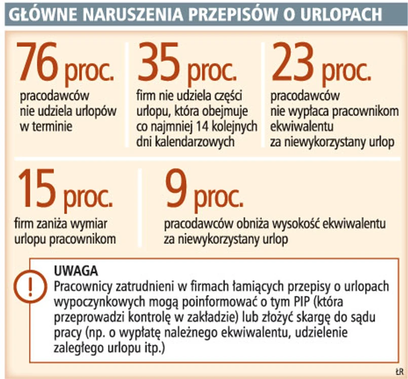 Firmy oszczędzają też na wypłaceniu pracownikom ekwiwalentu za niewykorzystany urlop. W 2008 roku tego typu świadczeń nie wypłacił podwładnym co czwarty skontrolowany przez PIP pracodawca. Zdaniem inspekcji wynikało to przede wszystkim z nieprawidłowego ustalenia wymiaru urlopu, jaki przysługuje danym pracownikom, oraz trudnej sytuacji ekonomicznej przedsiębiorstw.