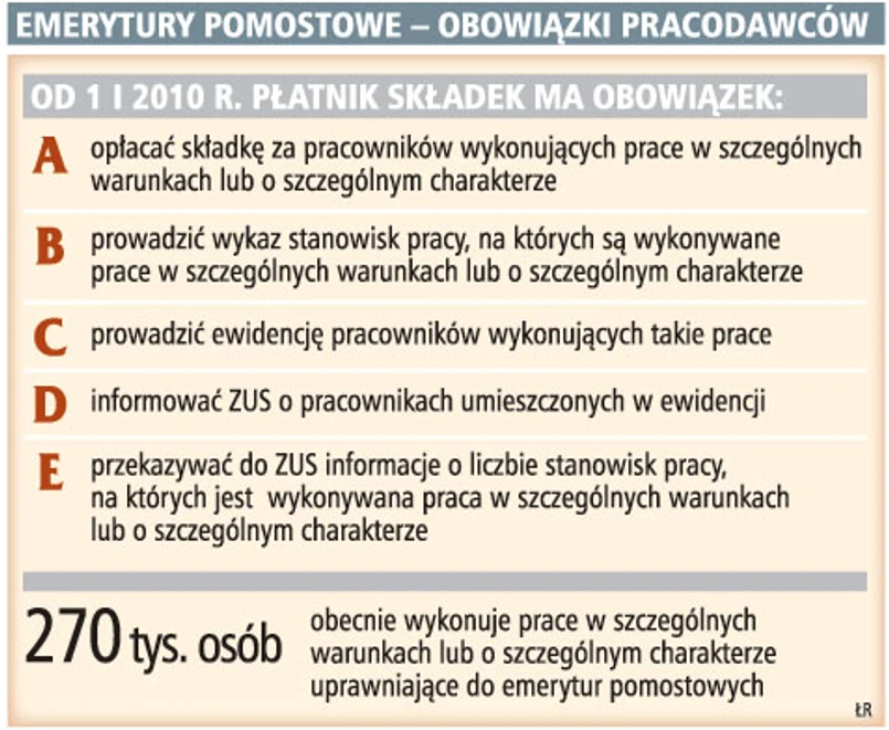 Od przyszłego roku pracodawcy zatrudniający osoby mające prawo do emerytur pomostowych muszą opłacać za nie dodatkowe składki do Funduszu Emerytur Pomostowych. Muszą też przygotować wykaz wszystkich stanowisk, na których jest wykonywana praca w szczególnych warunkach lub o szczególnym charakterze. Pracodawcy wielokrotnie sygnalizowali, że mają ogromne problemy z ustaleniem stanowisk uprawniających do emerytur pomostowych. Także związki zawodowe domagały się określenia jednoznacznych kryteriów, jakie muszą spełnić takie stanowiska.