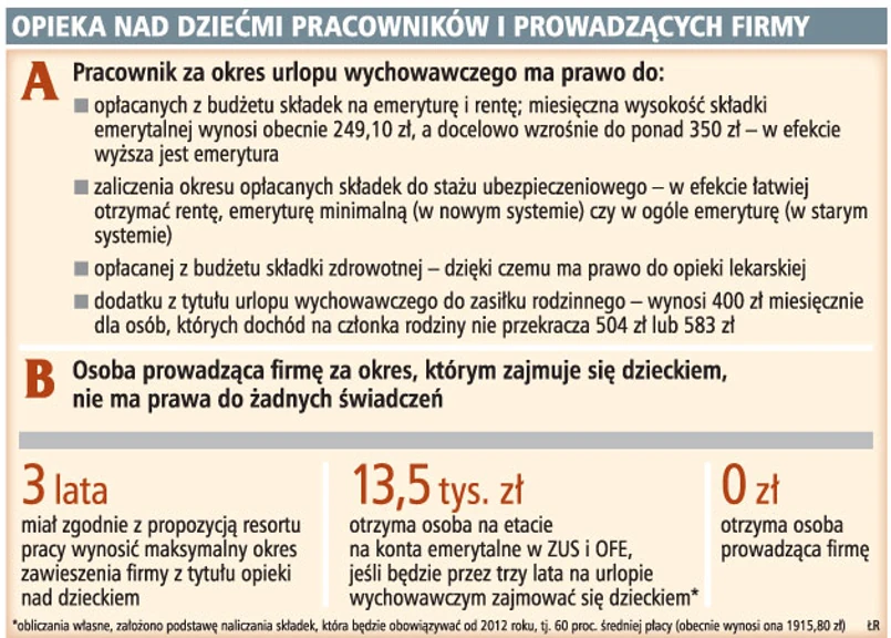 Osoby prowadzące firmy opłacają do ZUS i NFZ takie same składki (wysokość procentowa) jak pracownicy. Mimo to, są pod względem praw w okresie wychowywania dzieci traktowane gorzej. Urlop wychowawczy jest zarezerwowany wyłącznie dla pracowników. A dzięki niemu zyskuje się prawo do opłacanych z budżetu składek na emeryturę, rentę i ubezpieczenie zdrowotne.