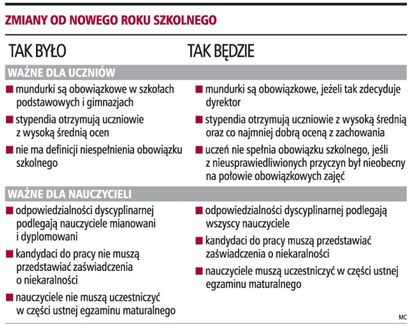 Nowe prawo - Tylko uczniowie z co najmniej dobrą oceną z zachowania otrzymają stypendia naukowe. Za czas pracy w komisjach maturalnych, przekraczający pensum, nauczyciele otrzymają płacę jak za nadgodziny. Dyrektorzy szkół zdecydują, czy uczniowie będą nosić mundurki i ile zapłacą za obiad w szkole.