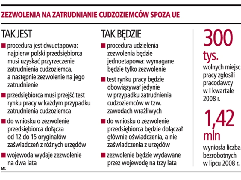 Ułatwienia związane z zatrudnianiem cudzoziemców są przewidziane w wysłanej już do konsultacji społecznych nowelizacji ustawy o promocji zatrudnienia i instytucjach rynku pracy. Procedura zatrudnienia cudzoziemca ma być jedno-, a nie dwuetapowa. Obecnie przedsiębiorca najpierw stara się o uzyskanie od wojewody przyrzeczenia zatrudnienia cudzoziemca, a następnie o zezwolenie na jego zatrudnienie.