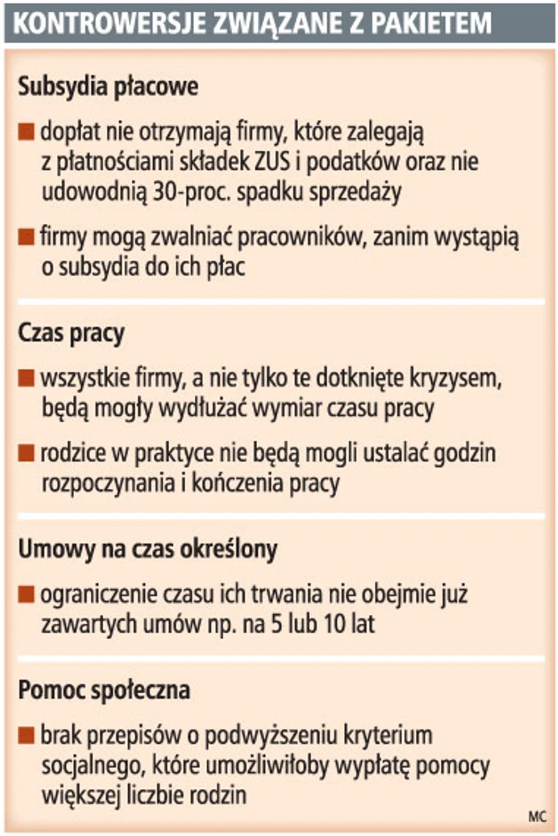 Konieczność udokumentowania 30 proc. spadku zamówień i brak zaległości wobec ZUS lub fiskusa mogą uniemożliwić wielu firmom korzystanie z dopłat do wynagrodzeń pracowników lub kierowanie na szkolenia refundowane z Funduszu Pracy. Dlatego zdaniem posłów należy złagodzić wymogi, jakie muszą spełniać firmy, aby mogły ubiegać się o pomoc na utrzymanie miejsc pracy. Tak wynika z debaty sejmowej podczas I czytania rządowego projektu ustawy o łagodzeniu skutków kryzysu ekonomicznego dla pracowników i przedsiębiorców. Sejm skierował projekt do dalszych prac w Komisji Polityki Społecznej i Rodziny. Rząd chce, aby specustawa została uchwalona jeszcze przed wakacjami parlamentarnymi. Szanse na to, że wejdzie ona w życie jeszcze przed jesienią, są duże, gdyż poparły ją wszystkie kluby i koła parlamentarne. Możliwe, że pracodawcy i pracownicy będą mieli około miesiąc na zapoznanie się z nowymi przepisami. O takiej vacatio legis mówiła w Sejmie Jolanta Fedak, minister pracy i polityki społecznej.