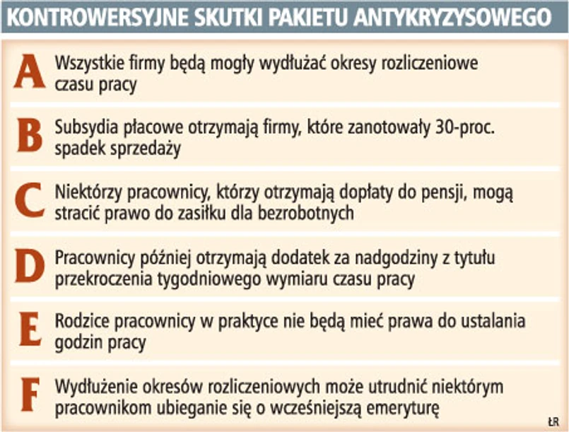 Z kolei przepisy o subsydiach płacowych mogą spowodować, że część pracowników utraci prawo do zasiłku dla bezrobotnych. W okresie ich pobierania (402,50 zł maksymalnie przez 6 miesięcy) będą oni pracować w zmniejszonym, niepełnym wymiarze czasu pracy i za proporcjonalnie niższe pensje. Tymczasem zasiłek dla bezrobotnych przysługuje osobom zatrudnionym, którzy w okresie 365 dni przed zarejestrowaniem w urzędzie pracy zarabiali co najmniej płacę minimalną. Warunku tego mogą więc nie spełnić pracownicy zwolnieni po okresie pracy w zmniejszonym wymiarze, którzy przed obniżeniem czasu pracy i pensji zarabiali niewiele więcej od płacy minimalnej.