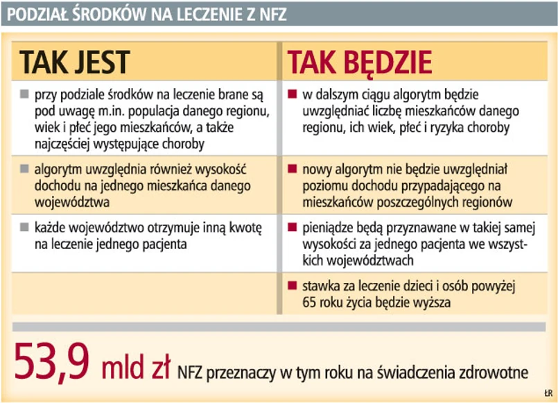 Obecnie podział środków na leczenie między poszczególne regiony jest uzależniony m.in. od wysokości przeciętnego dochodu przypadającego na jedno gospodarstwo domowe. To powoduje, że województwa, w których jest on niski, otrzymują mniej środków z NFZ. Takimi pokrzywdzonymi województwami są m.in. podkarpackie, warmińsko-mazurskie czy lubelskie. Gdyby algorytm nie brał pod uwagę dochodów, otrzymywałyby o około 400 mln zł więcej.