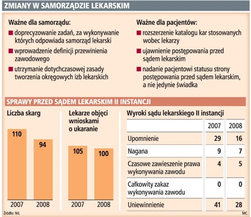 Projekt wprowadzi więc zmiany w postępowaniu przed sądem lekarskim. Przewiduje też większą liczbę kar, jakie sądy mogą stosować wobec specjalistów. Pod naciskiem samorządu lekarskiego resort zdrowia wycofał się jednak z propozycji dostosowania liczby izb lekarskich do podziału administracyjnego Polski.