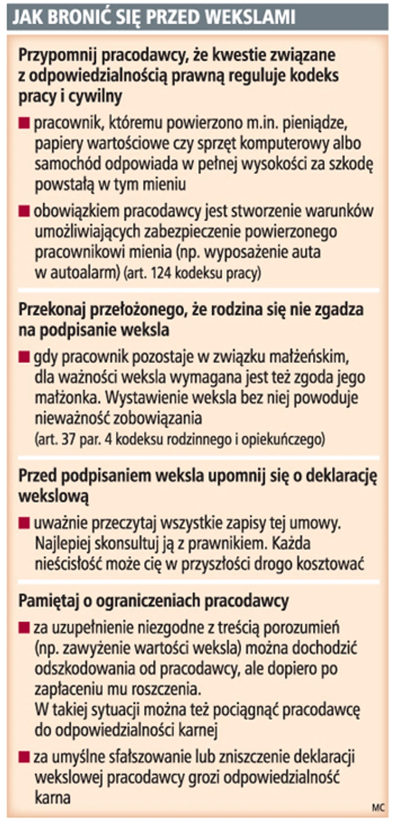 – Gdy firma żąda podpisania weksla, pracownik powinien dążyć do maksymalnego doprecyzowania warunków uzupełnienia i uruchomienia takiego weksla w deklaracji wekslowej. Pracodawca może bowiem bez problemu zbyć taki weksel i trudno będzie udowodnić przed sądem, że zobowiązanie powstało, np. w wyniku nawiązanego stosunku pracy – wskazuje Robert Mikulski.