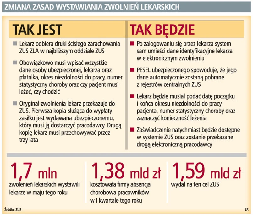 Automatyczne przesłanie informacji o niezdolności do pracy oraz pełna identyfikacja chorego spowodują, że pracownik będzie zwolniony z obowiązku dostarczenia zaświadczenia do pracodawcy. Na takim rozwiązaniu mają też zyskać firmy, które będą mogły kontrolować pracowników w czasie najkrótszego nawet zwolnienia lekarskiego.