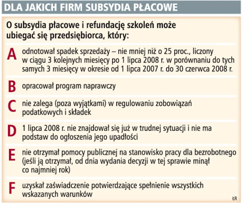 Nowe przepisy umożliwią firmom, które ucierpiały w kryzysie (patrz ramka) ubieganie się o dopłaty do pensji pracowników, którzy zgodzą się pracować w obniżonym wymiarze czasu pracy i za niższą pensję. Wysokość miesięcznej dopłaty wyniesie do 70 proc. zasiłku dla bezrobotnych (402,50 zł). Obniżona pensja i dopłata nie będą mogły być niższe od płacy minimalnej (1276 zł).