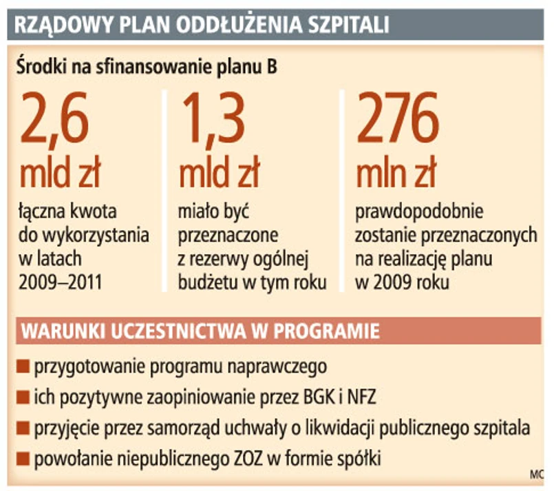 Rządowa propozycja dotycząca realizacji tzw. planu B, czyli wieloletniego programu wsparcia jednostek samorządu terytorialnego w działaniach stabilizujących system ochrony zdrowia, była często krytykowana. Mimo to rośnie zainteresowanie samorządowców przekształceniami samodzielnych publicznych zakładów opieki zdrowotnej (SP ZOZ). Ich reorganizacja w kształcie proponowanym przez Ewę Kopacz, ministra zdrowia, nie jest jednak prosta. Z jednej strony plan B ma być receptą na rozwiązanie problemu zadłużenia SP ZOZ, a z drugiej – zachętą do zmian struktury prawnej i organizacji szpitali.