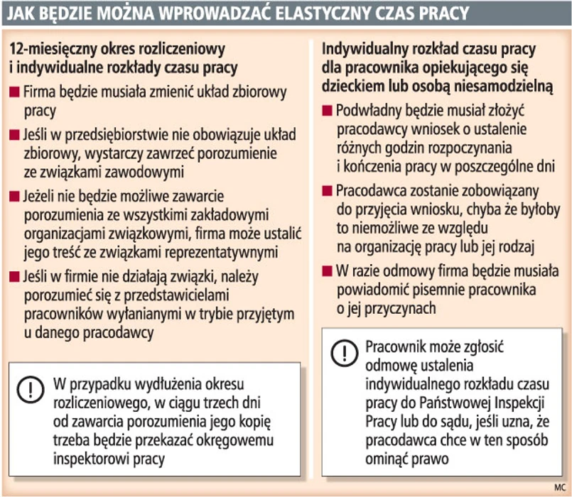 Dzięki nowym przepisom pracodawcy rzadziej będą płacić podwładnym za nadgodziny i łatwiej dostosują czas pracy do potrzeb produkcji. To dlatego, że za zgodą związków zawodowych lub przedstawicieli pracowników przedsiębiorcy będą mogli wydłużyć okresy rozliczeniowe czasu pracy do jednego roku. Obecnie, w większości firm trwają one do czterech miesięcy. Dzięki tej zmianie pracodawcy będą mogli wydłużać czas pracy podwładnych w okresie wzrostu zamówień lub sprzedaży i proporcjonalnie zmniejszać go w okresie dekoniunktury.