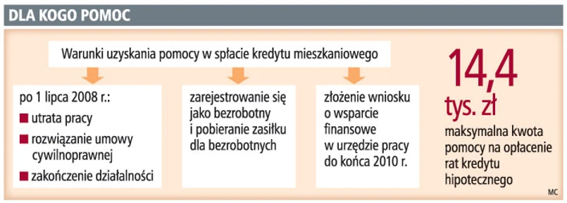 Prawie 50 tys. rodzin ma, według szacunków rządu, skorzystać z pomocy państwa w spłacie kredytów mieszkaniowych. Już w następną środę (5 sierpnia) wchodzi w życie ustawa z 19 czerwca 2009 r. o pomocy państwa w spłacie niektórych kredytów mieszkaniowych udzielonych osobom, które utraciły pracę (Dz.U. nr 115, poz. 964). Zgodnie z nią osoby, które straciły pracę lub zlikwidowały działalność gospodarczą, zarejestrowały się jako bezrobotne i mają prawo do zasiłku.