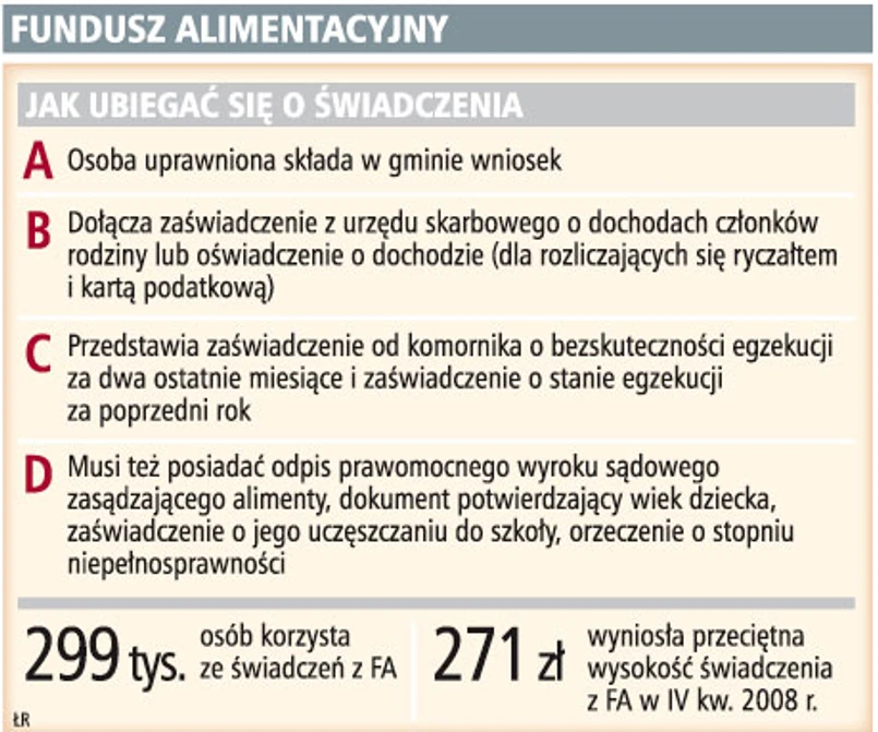 Potwierdzają to dane resortu pracy, który początkowo szacował nawet dwukrotny wzrost liczby uprawnionych. Do października 2008 r., kiedy obowiązywały przepisy o zaliczce alimentacyjnej, otrzymywało ją ponad 287 tys. osób. Z kolei w I kwartale tego roku liczba osób uprawnionych wyniosła niecałe 300 tys.