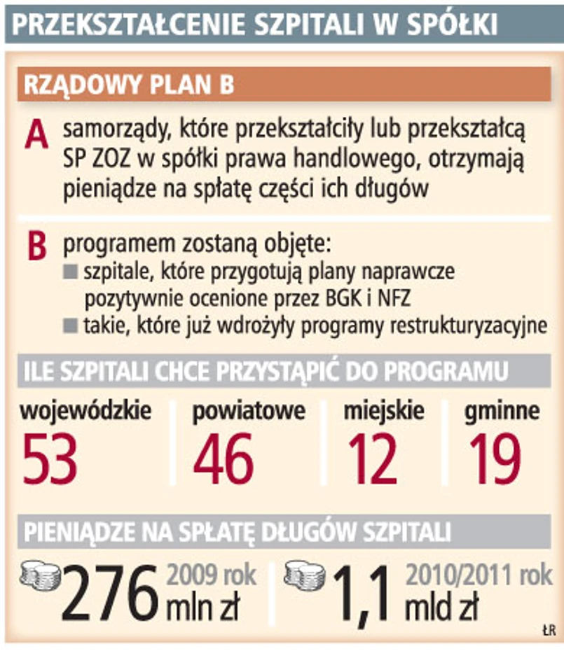 Również te samorządy, które jeszcze nie spłaciły długów przekształcanych szpitali, mogą część środków z planu B przeznaczyć na inne zadania, niekoniecznie związane z ochroną zdrowia. W takiej sytuacji o tym, na co zostaną wykorzystane środki z planu B, decyduje przyjęty przez samorząd harmonogram uregulowania długów.