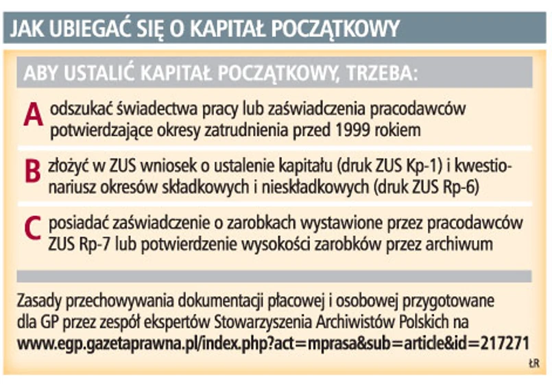 Twórcy reformy uznali, że najlepszym rozwiązaniem będzie policzenie wysokości kapitału początkowego za okres przed wejściem reformy emerytalnej. Prawo do niego mieli wszyscy urodzeni po 31 grudnia 1948 r., którzy do końca 1998 roku podlegali ubezpieczeniu przez co najmniej sześć miesięcy. Według ówczesnych szacunków takich osób miało być około 13 mln. Aby przyspieszyć ustalanie wysokości kapitału, płatnicy składek ustawowo zostali zobowiązani do skompletowania takiej dokumentacji do końca 2006 r. Niektórym firmom się to udało.