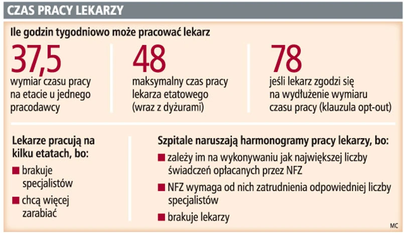 Tylko 17 proc. polskich lekarzy pracuje wyłącznie w wymiarze jednego etatu. Brak specjalistów powoduje, że szpitale zatrudniają ich, mimo że ci nie zawsze pracują wykazywaną liczbę godzin. NFZ może nałożyć karę grzywny na świadczeniodawcę nieprzestrzegającego harmonogramu pracy lekarzy.