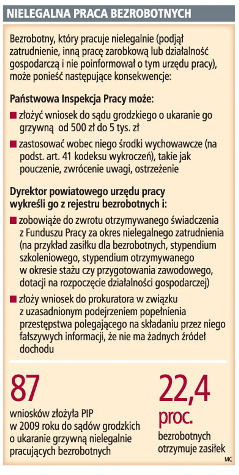 Niektórzy bezrobotni nie informują urzędu pracy o podjęciu stałego lub czasowego zatrudnienia. Bezrobotny może zapłacić co najmniej 500 zł grzywny za wykonywanie nielegalnej pracy. Państwa Inspekcja Pracy chce, żeby przedsiębiorcy informowali urzędy pracy o zatrudnianiu bezrobotnych.