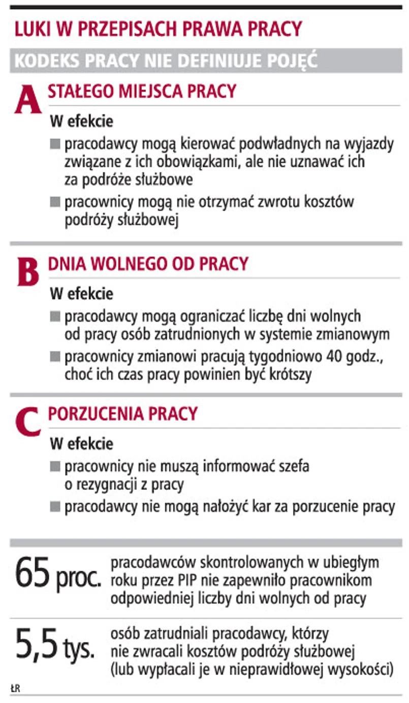 W kodeksie pracy brakuje m.in. definicji dnia wolnego i stałego miejsca pracy. Firmy wykorzystują luki w prawie i interpretują je na niekorzyść pracowników. Podwładni korzystają z faktu, że kodeks nie sankcjonuje porzucenia pracy.