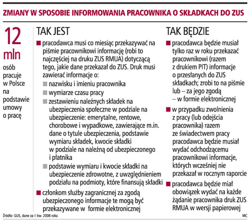 Ustawa z 13 października 1998 r. o systemie ubezpieczeń społecznych (Dz.U. z 2007 r. nr 11, poz. 74 z późn. zm.) nakłada na pracodawców obowiązek comiesięcznego poinformowania pracowników m.in. o składkach, jakie odprowadzili za niego do ZUS i NFZ. Firmy najczęściej w tym celu posługują się przygotowanymi przez ZUS drukami ZUS RMUA. Posłowie chcą, aby od przyszłego roku pracownicy otrzymywali takie raporty nie co miesiąc, ale raz w roku wraz z formularzem PIT-11. Firma byłaby jednak zobowiązana do ich wydania na każde żądanie ubezpieczonego. Także pracownik, który będzie odchodził z pracy w ciągu roku, otrzyma raport potwierdzający opłacenie składek. Od samego zainteresowanego będzie zależeć, czy takie poświadczenia otrzyma w formie papierowej czy elektronicznej.